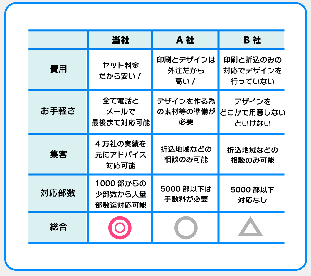 4万社の制作実績によるデータに基づく反響が取りやすいデザインやキャッチコピーをご提案させていただきます。(デザインやキャッチコピーによって反響は大きく変わってきます)